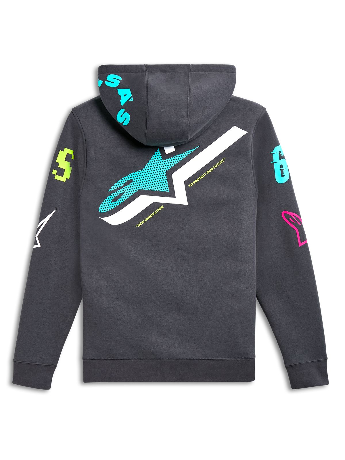 Ilustración con varios logotipos en la parte delantera, las mangas, la espalda y la capucha